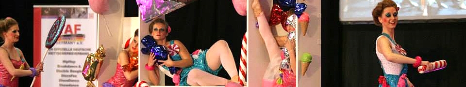 > Gruppe: In the Candy Shop - ist mal was ganz anderes. Bon Bon Farben überall und riesengroße Süßigkeiten, gemixt mit verschiedenen Musiken zum Thema Candy. Nachts, wenn alles schläft, erwachen die übergroßen Süßigkeiten in ihrem Regal und dann ist Party angesagt. Verschiedene Stilarten der Musik und der Tanz-Moves machen diese Show sehr abwechslungsreich.